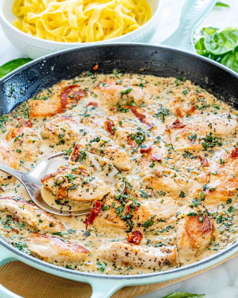 - Tuscan Chicken Pasta: Slice the chicken, make extra sauce, and toss it together with cooked pasta.