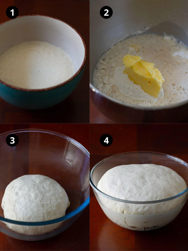 In a large mixing bowl, add flour, salt, and softened butter. Pour in the yeast mixture and start mixing until a rough dough forms.